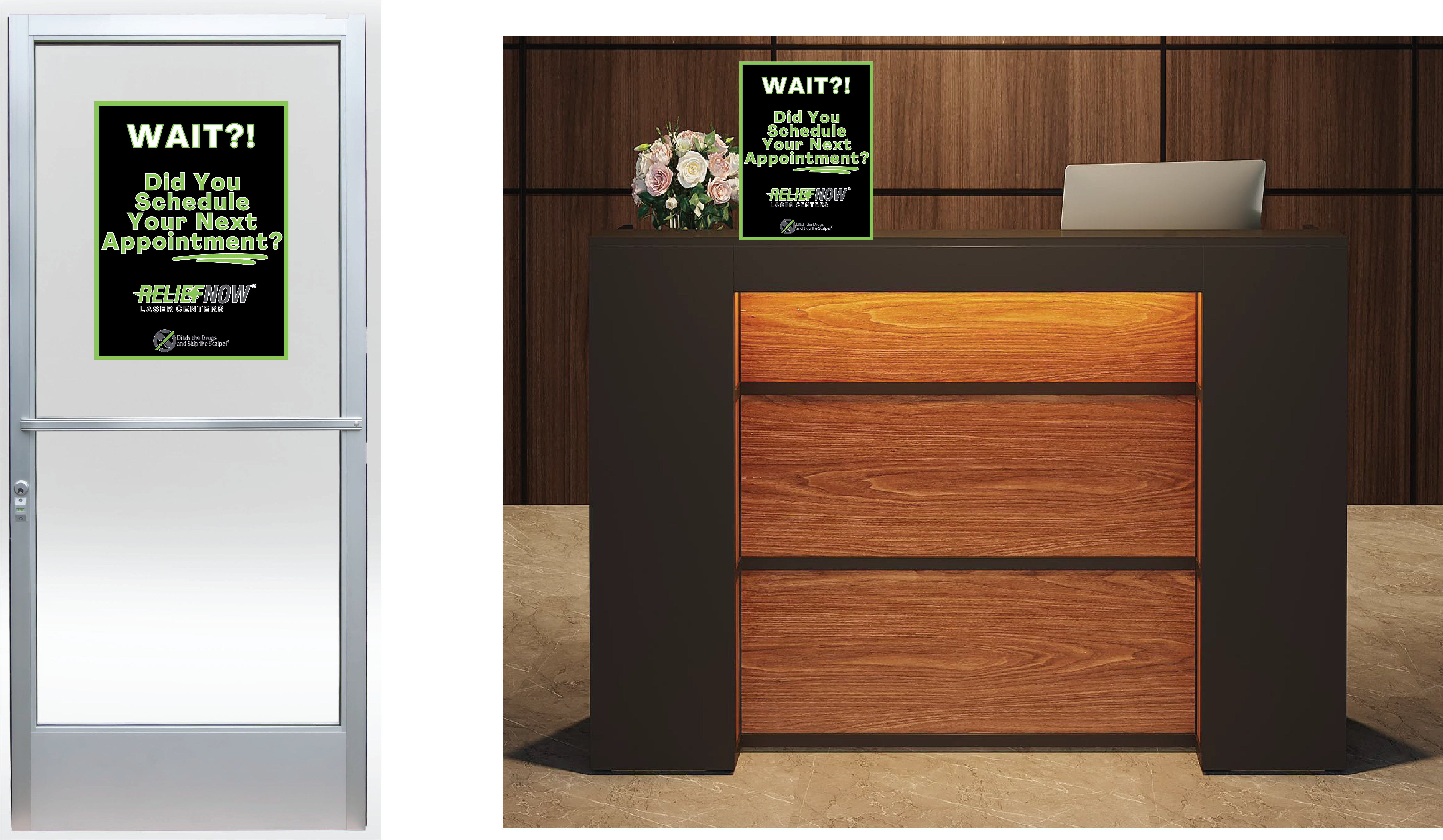 Remind your clients to book their next appointment before they leave your office! Decals that can be placed on the exit doors, or tabletop signs that have easel backs to be placed directly on your reception desk. Standard size is 11" x 17", custom sizes available.